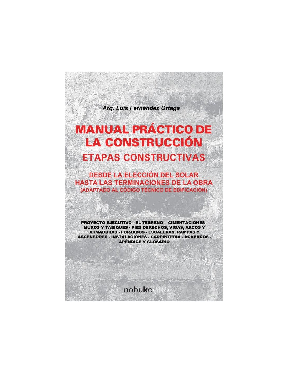 El presente texto, en lugar de considerar la obra como un hecho consumado, analiza las etapas de la construcción en forma correlativa uniendo unas con otras hasta llegar a la finalización del edificio. También se han dejado expresamente de lado los elementos del diseño y de cálculo por pertenecer a la etapa anterior a la iniciación de la obra en sí, a no ser de los cálculos elementales necesarios para solucionar problemas puntuales. Nuestra intención, al iniciar los trabajos de este manual, fue la de dotar a los técnicos y constructores, que se supone conocedores de estas especificaciones,de una guía o recordatorio útil que les pueda solucionar los problemas cuando se encuentren con ellos en el transcurso de una obra, y para los estudiantes, la posibilidad de introducirse en la especialidad mediante la correlación de tareas. Se ha puesto especial hincapié en que la solución de esos problemas sea en base a través de la imagen, por lo que se ha dotado a la obra con más de 650 ilustraciones. También se ha tenido especial interés en que la obra pueda ser útil tanto a españoles como hispanoamericanos, tratando de que el lenguaje técnico pueda entenderse en ambos continentes. No obstante, también en estos casos creemos que la interpretación queda solucionada con las imágenes que son un idioma universal.